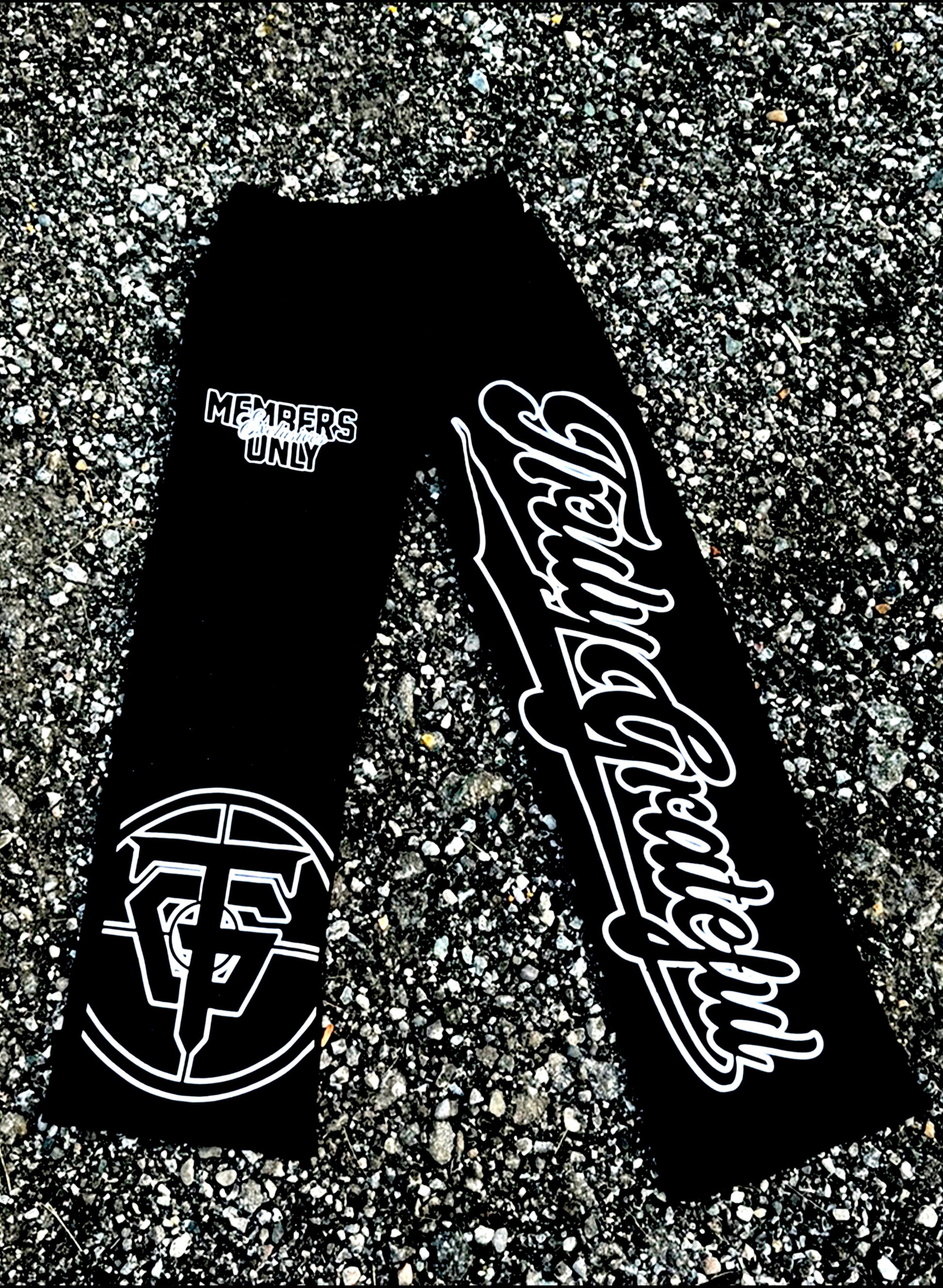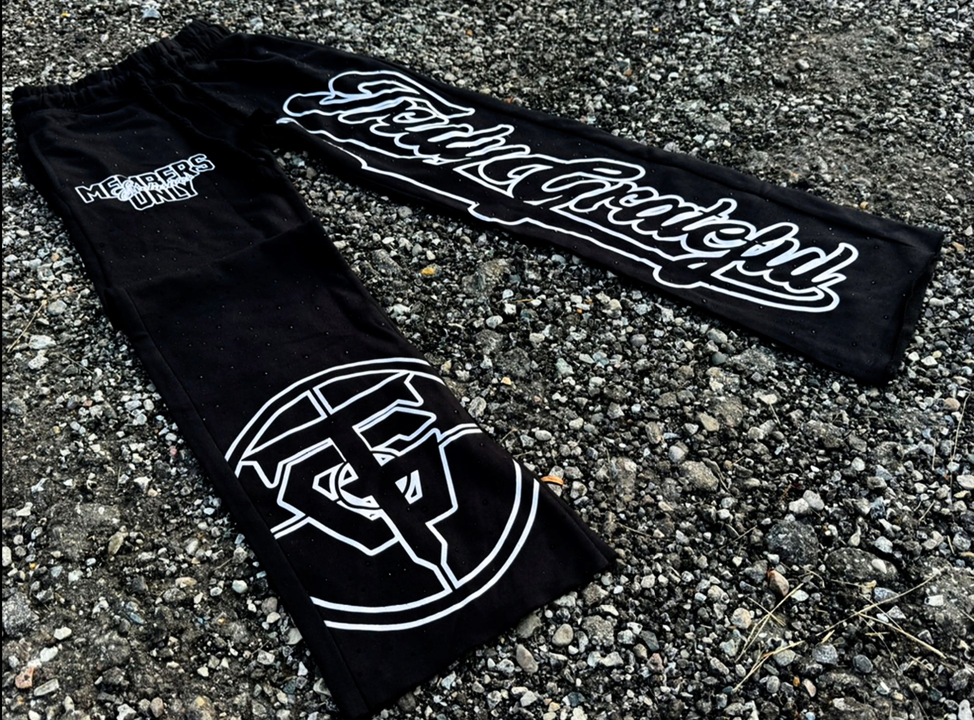 Oversized sweats that features our “Members Only” text on the upper thigh, large “Truly Grateful” script down the left leg, and signature TG monogram logo on the lower right leg.
