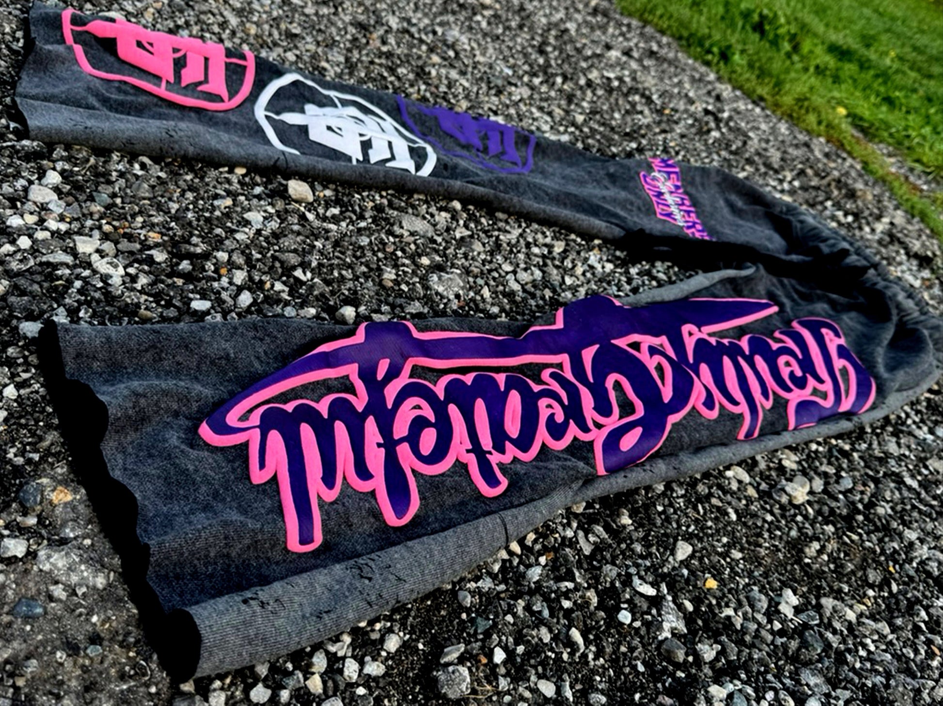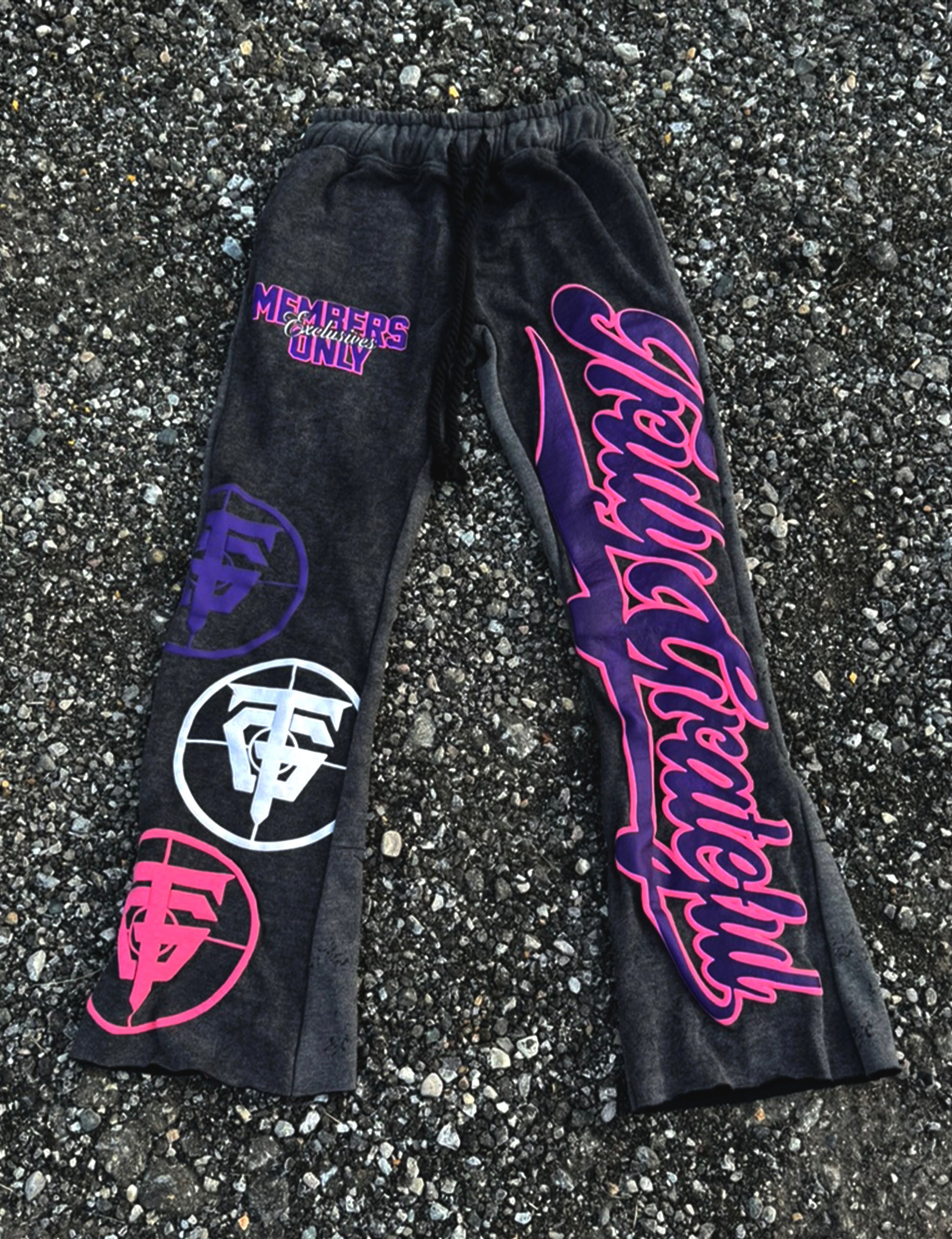Oversized sweats that feature our bold "Members Only" text on the upper thigh, stacked TG monogram logos down the right leg, and a large "Truly Grateful" script running along the left leg.